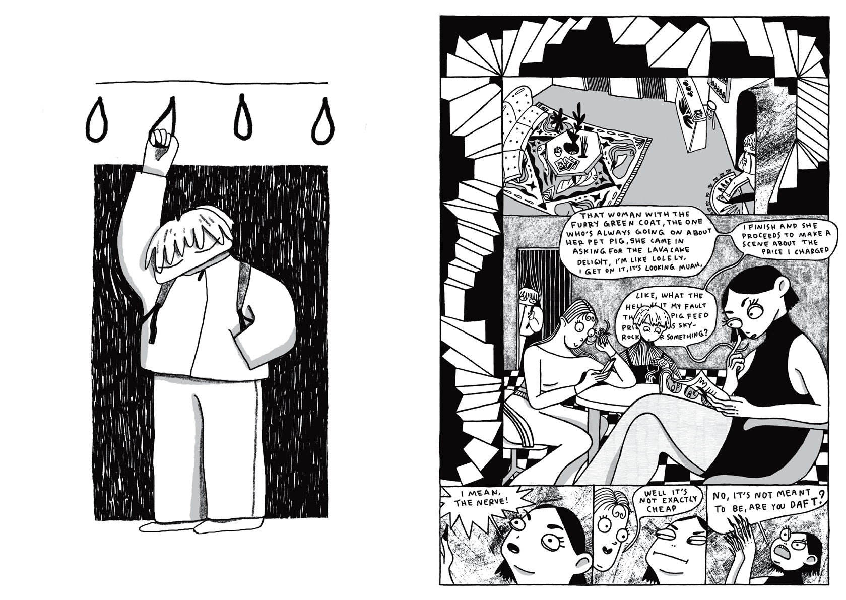 An original story comic about the landscape of modern life, through the eyes of a disillusioned young woman. It is a melancholic story told as a comedy, mixed with elements of magical realism. The protagonist works in a nail salon, spending every day as an impassive spectator, when the arrival of a new customer brings with it fatally bad news. Faced with a most unusual challenge, she must call to her survival instincts for help.